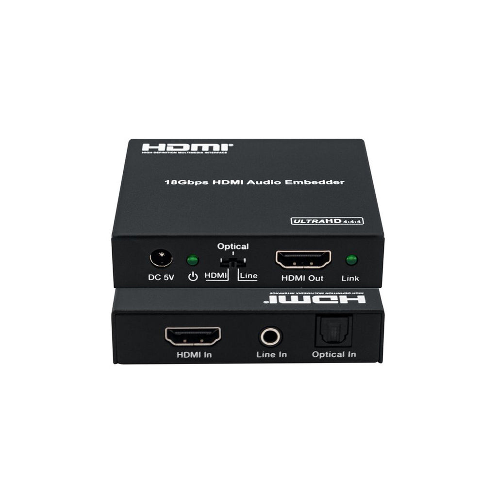 - Embeds multi-channel optical (SPDIF) or Line analog audio to HDMI output