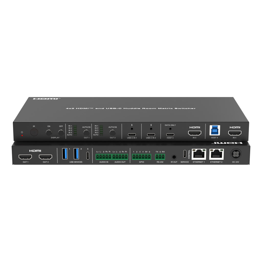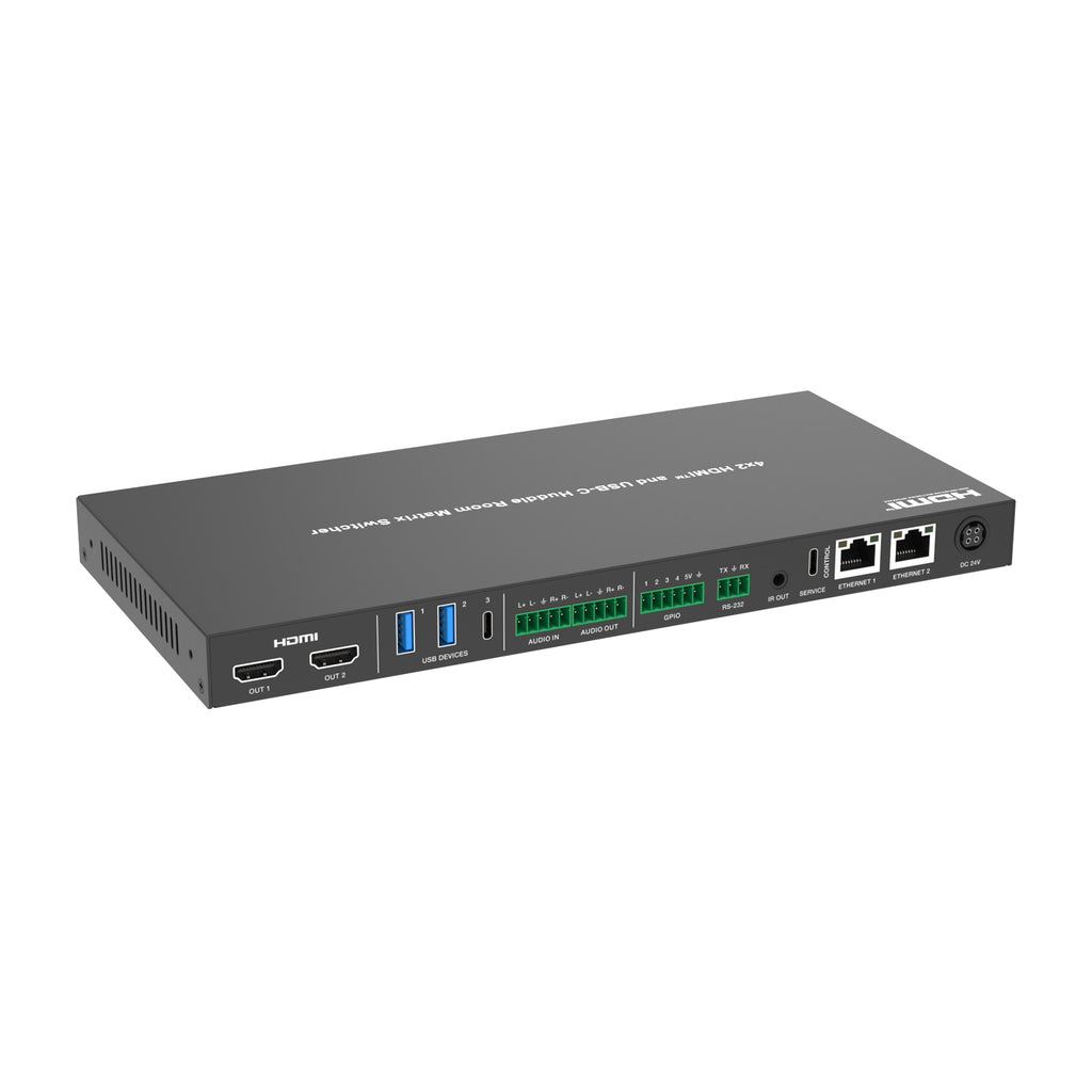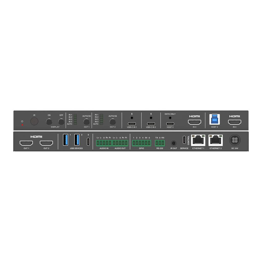 DVDO-USBC-HDMI-PS-42-XL is a 4x2 presentation switcher with 2 HDMI & 2 USB-C inputs, 2 HDMI outputs, 2 USB Host ports, dual Ethernet ports and separate balanced/un-balanced analog audio input and output.